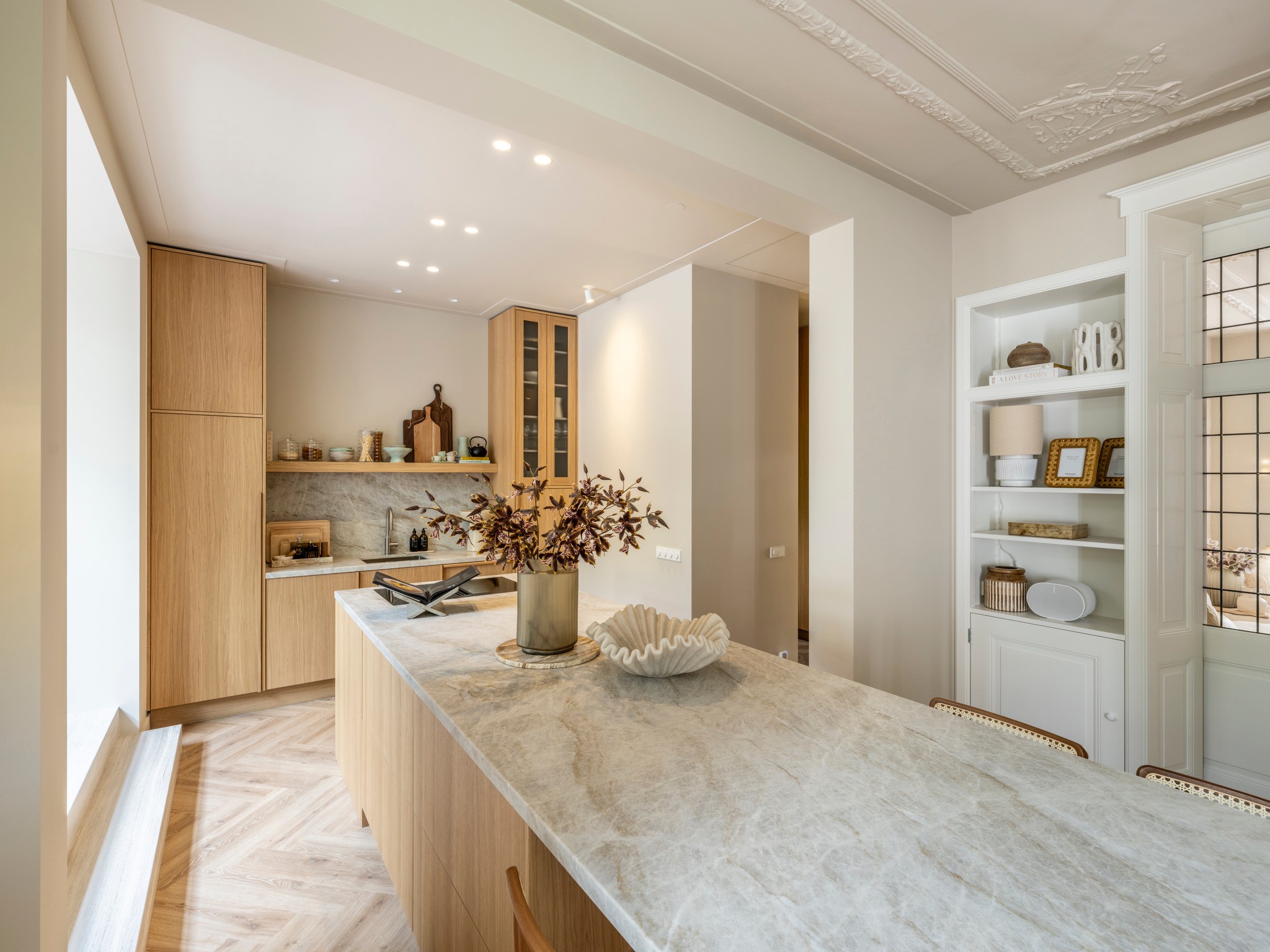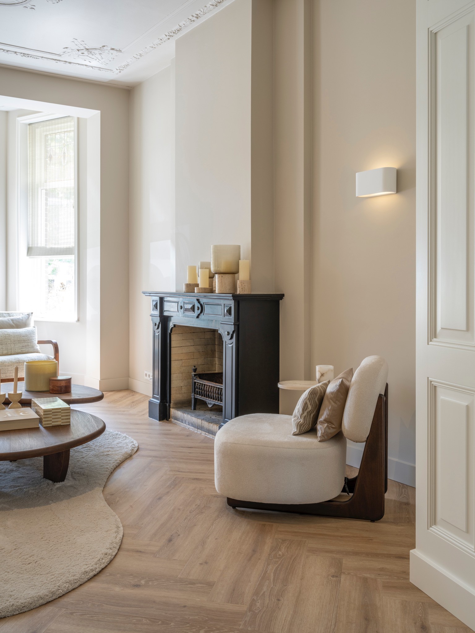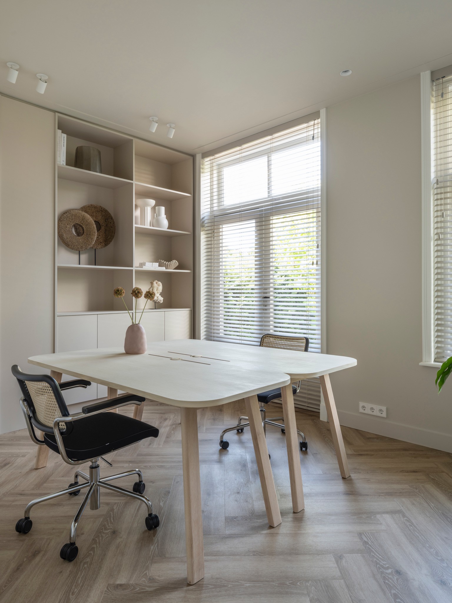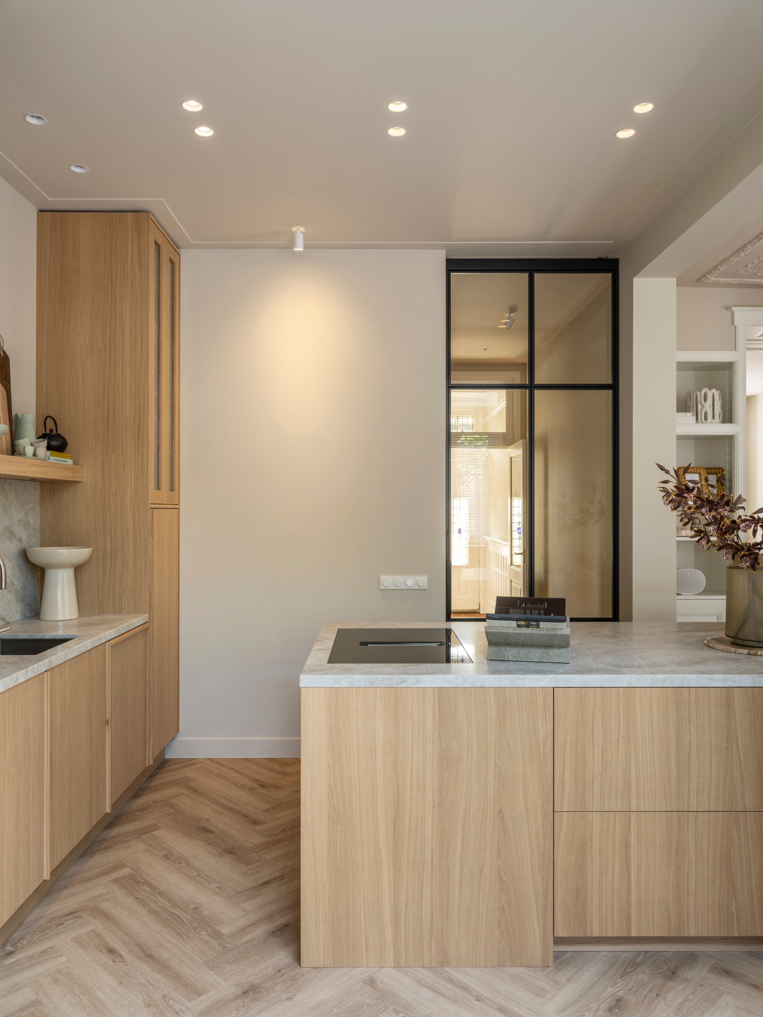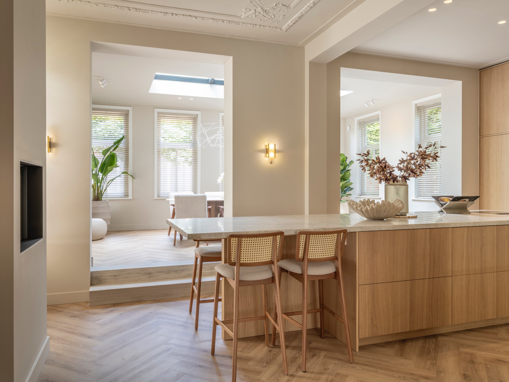 Dit herenhuis uit 1902, ontworpen door architect De Haan en sinds 2008 aangewezen als gemeentelijk monument, is in samenwerking met QMT Architecten volledig gemoderniseerd. Daarnaast kreeg de woning een nieuw, multifunctioneel bijgebouw waarin de opdrachtgevers gasten kunnen ontvangen, kunnen sporten en kunnen ontspannen in de sauna. Onze opdracht: de volledige woning transformeren naar de woonstandaarden van 2025 en een interieur creëren dat rust en balans brengt in het drukke leven van de bewoners. De sfeer is geïnspireerd op Japandi-invloeden, met het gebruik van diverse houtsoorten en een palet van lichte ton-sur-tonkleuren.
