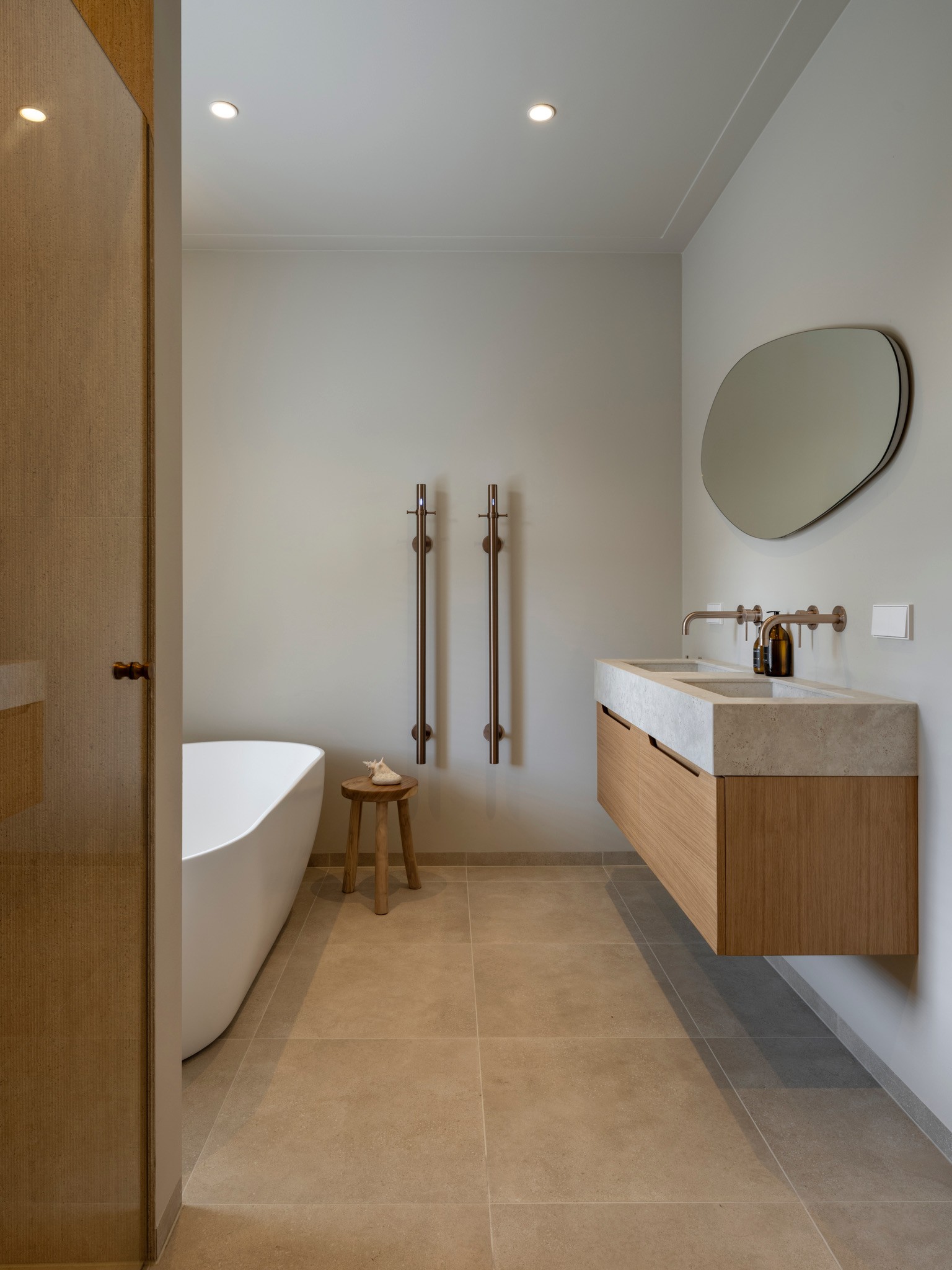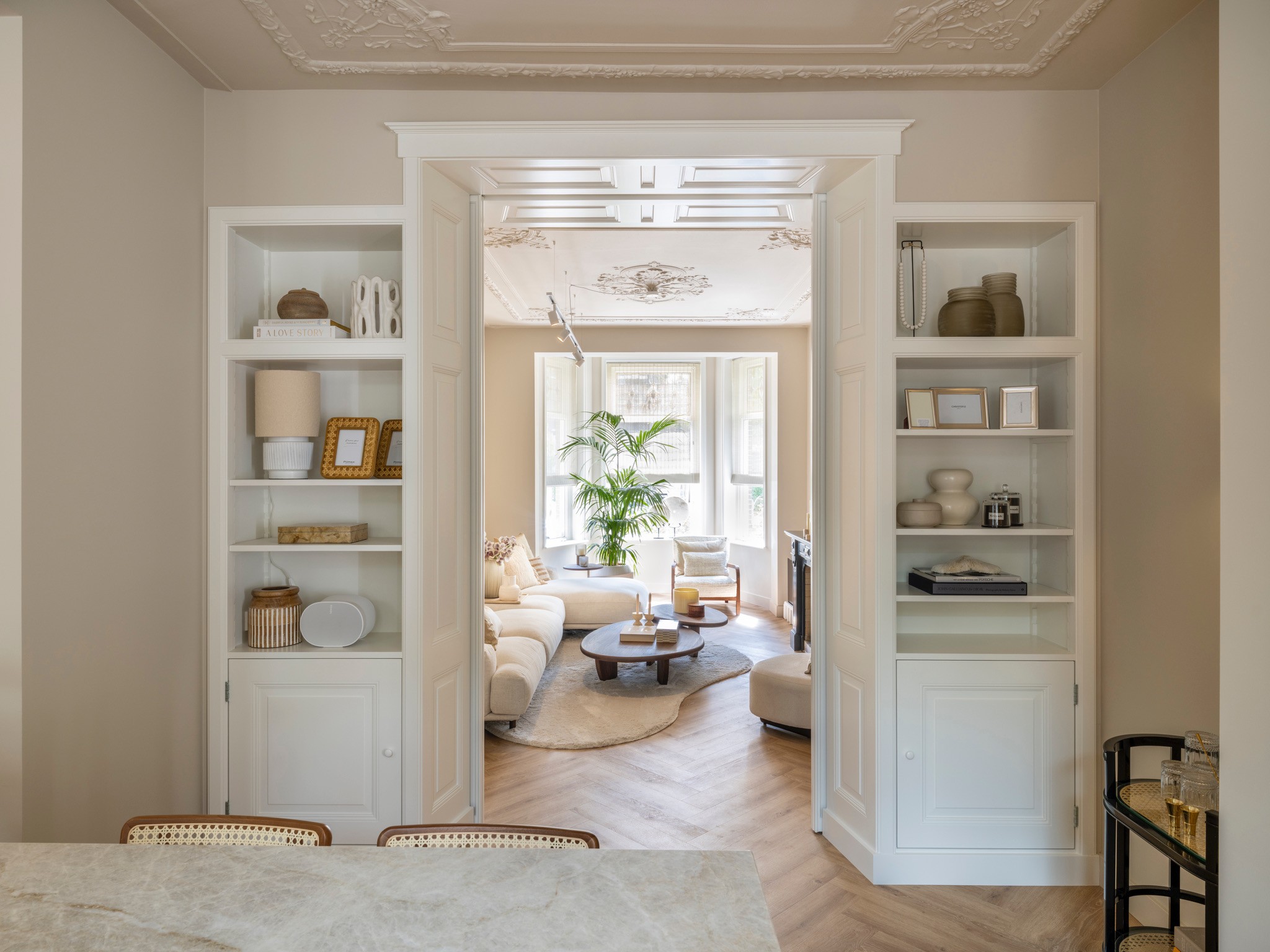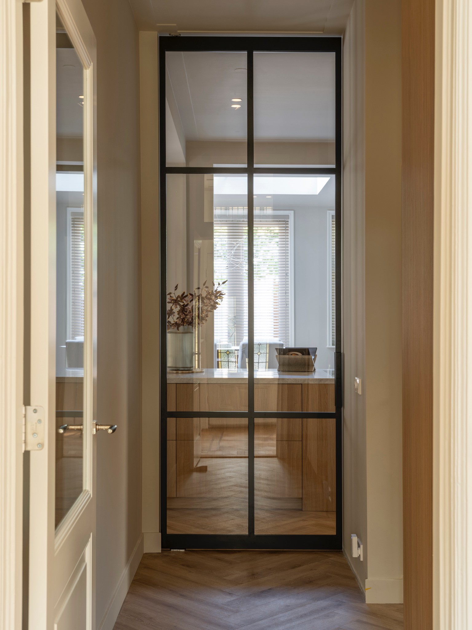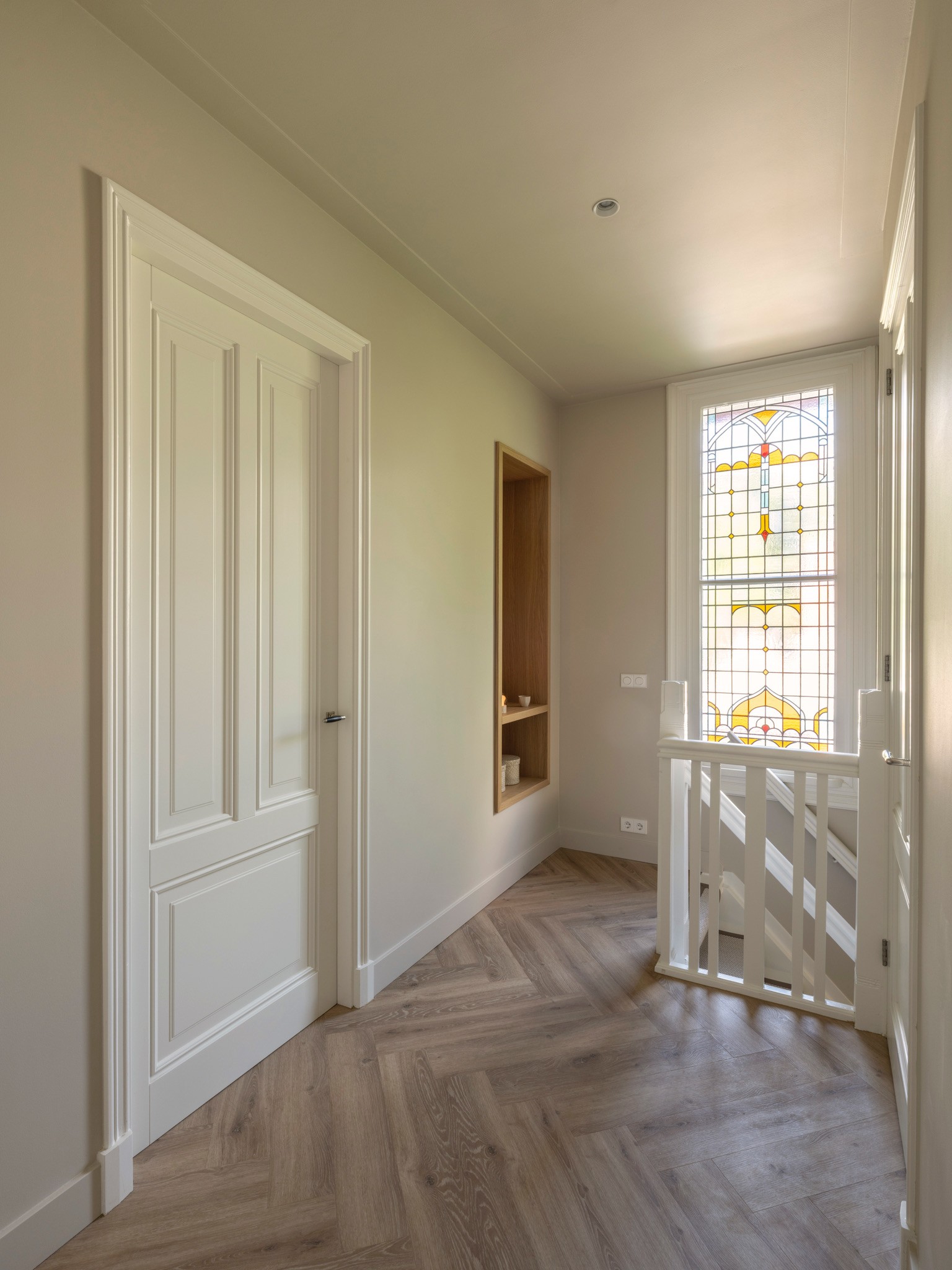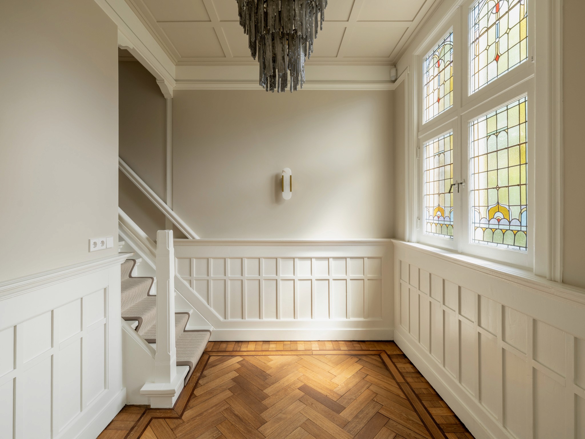 Dit herenhuis uit 1902, ontworpen door architect De Haan en sinds 2008 aangewezen als gemeentelijk monument, is in samenwerking met QMT Architecten volledig gemoderniseerd. Daarnaast kreeg de woning een nieuw, multifunctioneel bijgebouw waarin de opdrachtgevers gasten kunnen ontvangen, kunnen sporten en kunnen ontspannen in de sauna. Onze opdracht: de volledige woning transformeren naar de woonstandaarden van 2025 en een interieur creëren dat rust en balans brengt in het drukke leven van de bewoners. De sfeer is geïnspireerd op Japandi-invloeden, met het gebruik van diverse houtsoorten en een palet van lichte ton-sur-tonkleuren.